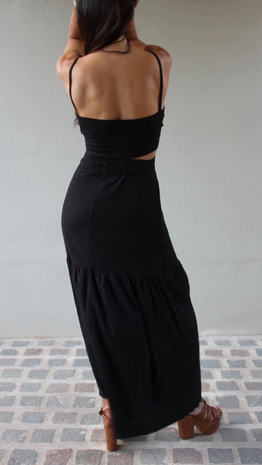 Escote en V con breteles regulables, falda con cintura elastizada.